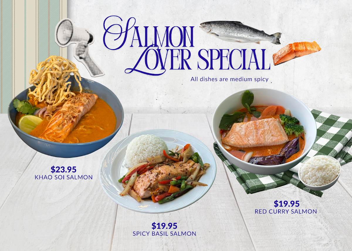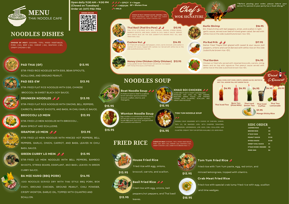 The heart of the menu shines through its curries and noodle dishes. Classic choices like Green Curry (GF), Red Curry (GF), and Yellow Curry (GF) deliver rich, aromatic flavors, while noodle staples such as Pad Thai (GF), Pad See-Ew, Drunken Noodles, Broccoli Lo Mein, and Grapow Lo Mein provide comforting yet bold options. The Chef’s Wok Signature section adds depth with standout dishes like Thai Basil (Pad Gra Pow), Cashew Nut, Honey Lime Chicken, Garlic Shrimp, and Pla Rad Prik, showcasing the kitchen’s versatility.