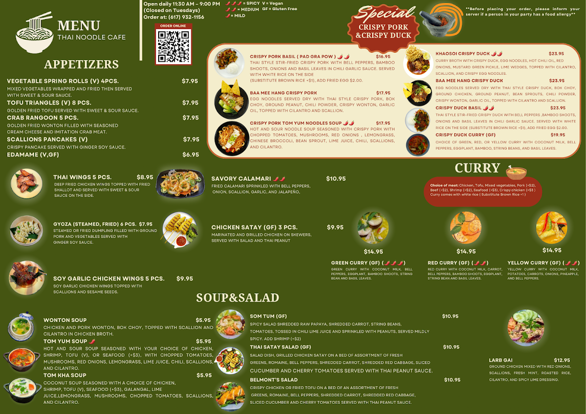 From a reviewer’s perspective, the menu at Thai Noodle Cafe feels like a well-rounded celebration of classic Thai comfort food, offering something satisfying for every kind of diner. The Appetizers set the tone with familiar favorites such as Vegetable Spring Rolls (V), Gyoza (steamed or fried), Tofu Triangles (V), Crab Rangoon, and Edamame (V, GF)-all ideal for sharing. Moving into soups and salads, comforting bowls like Wonton Soup, Tom Yum Soup, and Tom Kha Soup (GF) pair nicely with vibrant options such as Som Tum (GF), Thai Satay Salad (GF), Belmont’s Salad, and Larb Gai, which highlight the balance of spice, citrus, and herbs that Thai cuisine is known for.