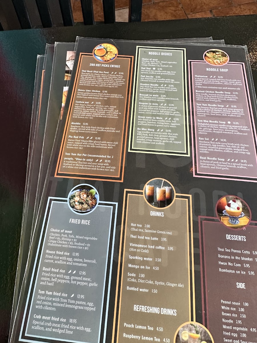 Rice and noodle soup lovers are equally well served with House Fried Rice, Basil Fried Rice, Tom Yum Fried Rice, and Crab Meat Fried Rice, alongside warming bowls such as Boat Noodle Soup, Wonton Noodle Soup, Kao Soi Chicken, and Tom Yum Noodle Soup. For something indulgent, the Special Crispy Pork & Crispy Duck selections-Crispy Pork Basil (Pad Gra Pow), Baa Mee Hang Crispy Pork, Crispy Pork Tom Yum Noodles Soup, Khao Soi Crispy Duck, and Baa Mee Hang Crispy Duck-stand out as highlights. Rounding out the experience are refreshing drinks like Thai Iced Tea, Nom Yen (Pink Milk), Thai Iced Green Tea, Thai Iced Coffee, and Thai Tea Lime, followed by comforting desserts such as Mango Sticky Rice and Taro Ball, with practical Side Orders like Jasmine Rice, Brown Rice, Sticky Rice, Peanut Sauce, and Gyoza Sauce completing a menu that feels both comprehensive and satisfying.